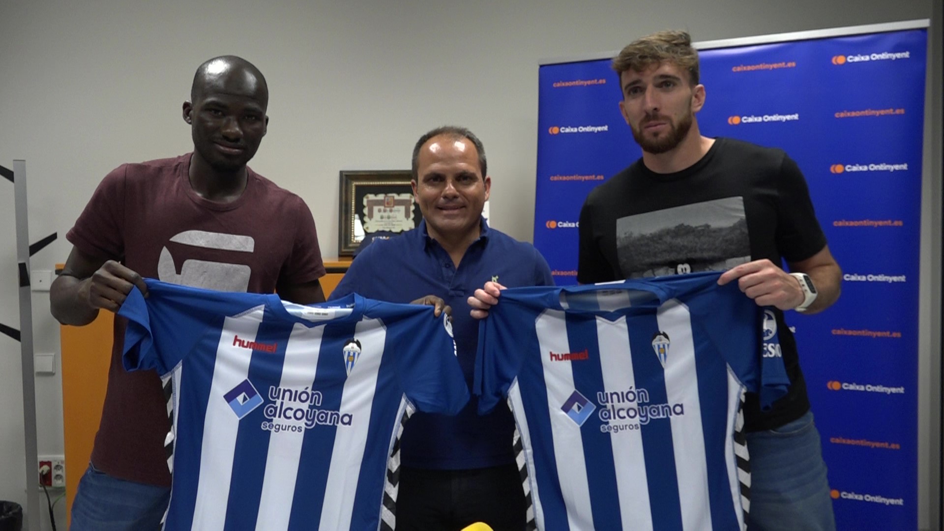Diakité i Garcés posen junt amb el Secretari Tècnic alcoianista durant la seua presentació