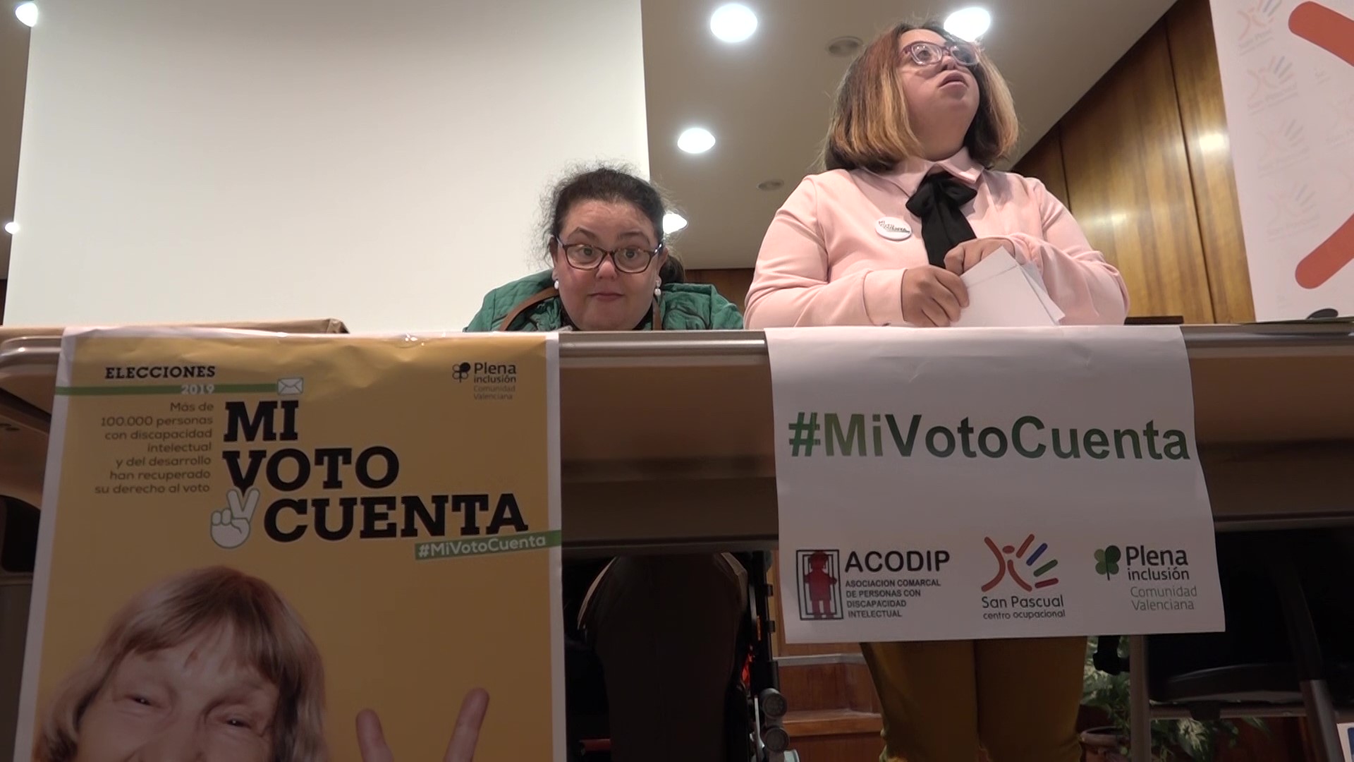 Dos de les membres de la campanya llueixen els cartells per la igualtat del seu vot