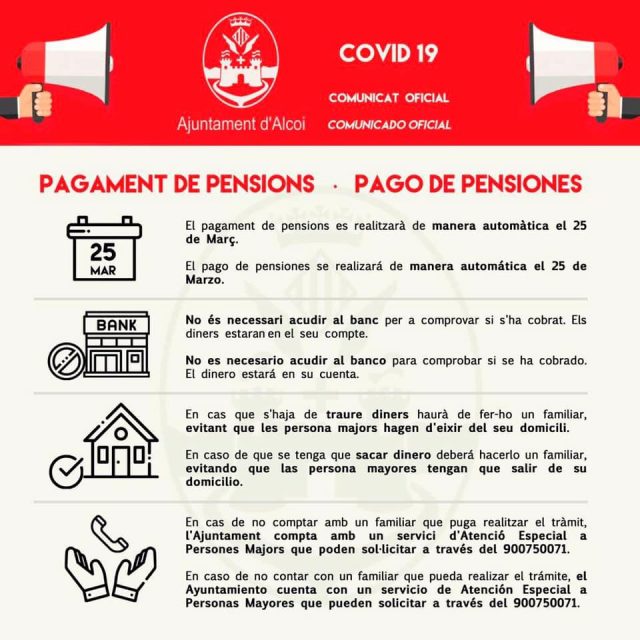 Des de l’Ajuntament d’Alcoi tambe informen a tots els pensionistes que el pagament de les pensions es realitzarà de manera automàtica el dia 25 de Març, que no és necessari acudir al banc per a comprovar si ha cobrat. En el cas que necessite traure diners, ha de fer-ho un familiar, evitant d’aquesta forma que les persones majors hagen d’eixir del seu domicili. Si no té cap familiar que puga realitzar aquest tràmit, l’Ajuntament compta amb un servei d’Atenció especialitzada.