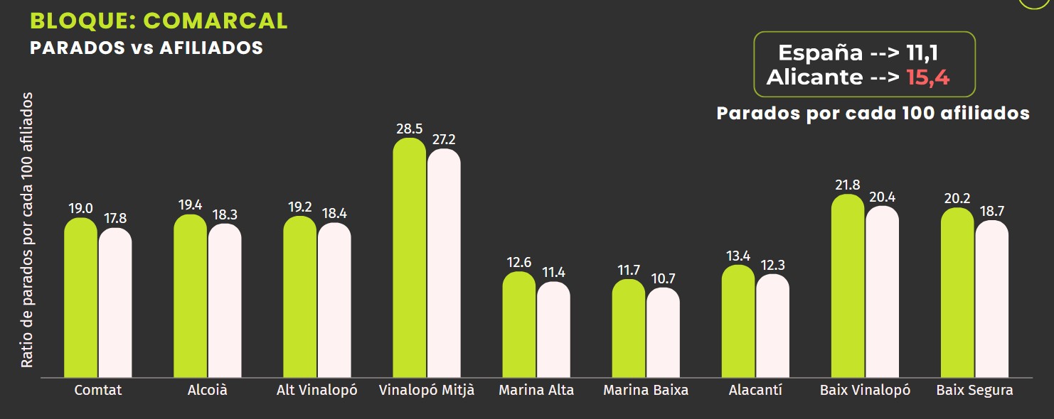 Les comarques de la muntanya alacantina segueix mantenint bones dades respecte a aturats i afiliats a la Seguretat Socials. Tots dos indicadors es troben quasi en màxims des de fa 15 anys. Durant el darrer any, les dos comarques han reduït la diferència entre estos dos indicadors en més d’1,1 punts, tot i que el diferencial segueix sent més de 7 punts superior a la mitjana nacional -17,8% i 18,3% al Comtat i l’Alcoià, respectivament, pel 11,1% nacional-.