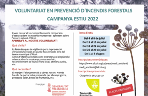 Ja està obert el termini per inscriure's en la Campanya 2022 del Voluntariat Mediambiental en prevenció d'incendis forestals. Aquest any hi haurà 5 torns:...