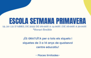 Els dies 19, 20 i 21 d'abril tindrà lloc l'Escola de la Setmana de la Primavera en horari de 8 a 14 hores i...