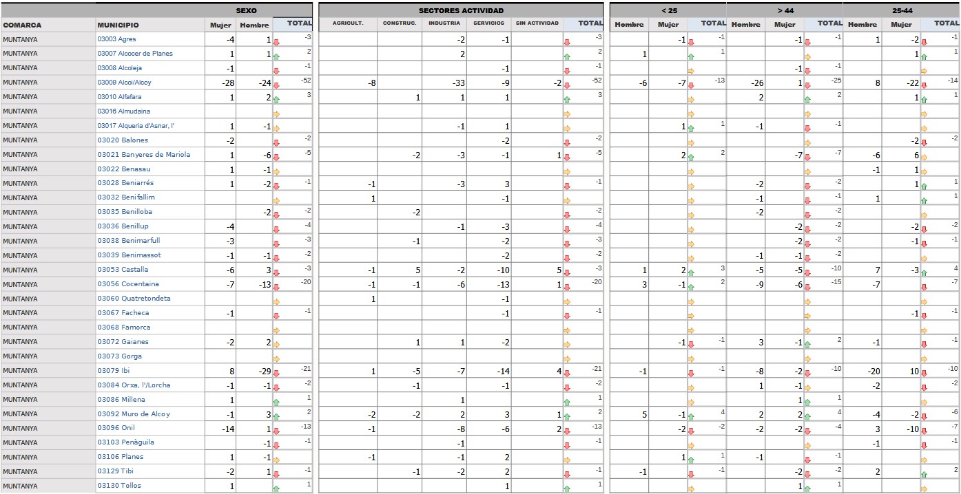La creació d’ocupació s’ha donat en tots els sectors productius de la muntanya alacantina a excepció d’aquelles persones que acaben d’encetar la seua recerca activa de treball. Així, durant el mes de febrer ha sigut la indústria el sector que més ha reduït la taxa d’atur amb 63 aturats menys que al gener, seguida dels serveis amb 57 menys. El sector agrari ha davallat en 12 persones les seues dades d’aturats, mentre que la construcció ho ha fet en 8 persones.