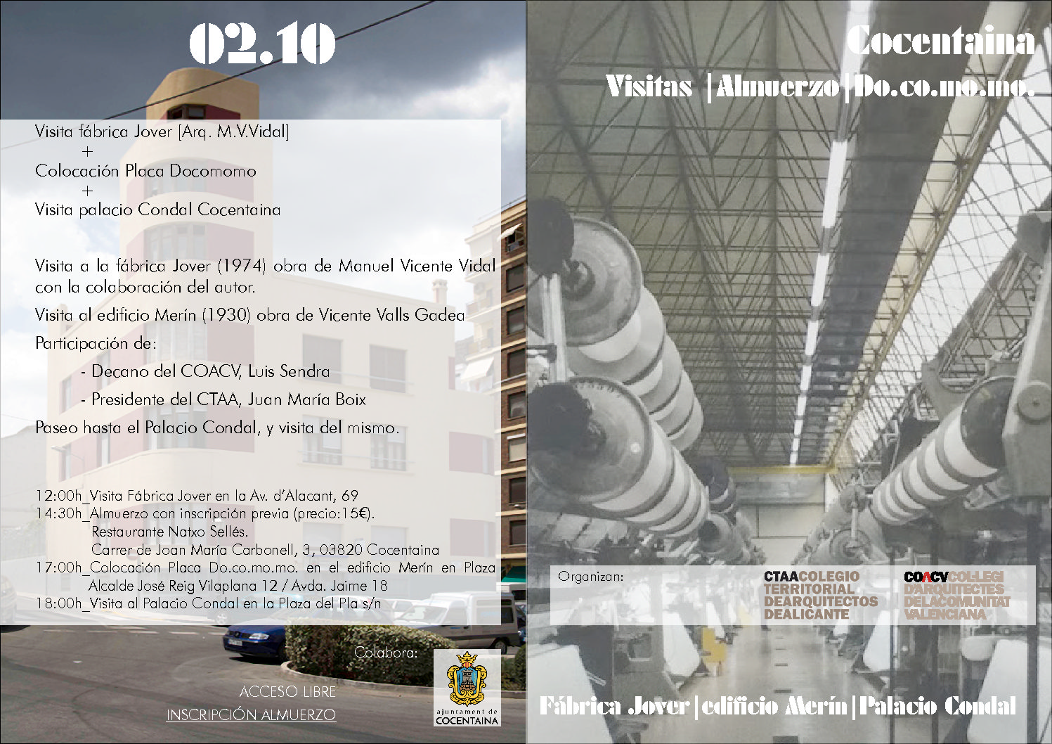 La visita dels arquitecte alacantins ha començat per la fabrica Jover, obra de Manuel Vicente i que suposa tot un exemple d’arquitectura industrial. La següent parada ha sigut per a degustar la gastronomia contestana, mentre que el gros de les activitats està previst per a la vesprada de dimecres 2 d’octubre. És llavors quan els arquitectes han reconegut l’edifici Merín de Cocentaina com a singular.