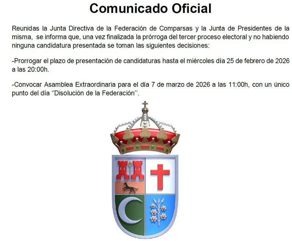 La situació ha arribat a un punt quasi de no retorn, degut a que l’actual Directiva ha pres les que seran les penúltimes decisions que executarà com a tal: prorrogar fins al 25 de febrer el termini per a rebre candidatures, una tasca per a la que està comptant amb el suport de l’Ajuntament per a posar en contacte possibles aspirants; i una segona més radical, que suposaria que, en cas de no aparèixer cap candidatura, es dissoldria la comissió tal i com es coneix hui en dia en Assemblea Extraordinària el proper 7 de març.