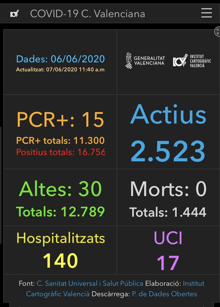 La Comunitat Valenciana acumula dos dies seguits sense cap defunció per coronavirus. D’aquesta manera, el total continua sent de 1.444. Per províncies: 221 a Castelló, 504 a Alacant i 719 a la província de València.