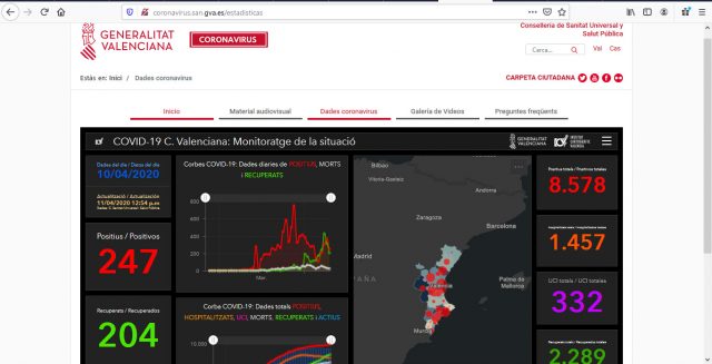 La Conselleria de Sanitat Universal i Salut Pública ofereix un nou espai al portal web sanitari de coronavirus on es podrà consultar l’evolució diària de casos, defuncions i altes, així com el nombre total de positius i de morts per departaments de salut (http://coronavirus.san.gva.es/estadisticas). Aquesta eina s’ha desenvolupat amb la col·laboració de l’Institut de Cartografia Valencià i conté una sèrie de dades que s’actualitzaran de manera diària. D’una banda, es podran consultar les dades de l’últim dia (casos positius, persones recuperades i morts). De l’altra, dues gràfiques. La primera mostrarà l’evolució, dia a dia, de positius, defuncions i altes, i la segona inclourà també hospitalitzats i ingressats a UCI, mostrant així l’evolució de la corba d’aquesta pandèmia a la Comunitat Valenciana. Les persones usuàries comptaran també amb una secció que mostra informació per departaments de salut. Es tracta, d’una banda, d’un mapa interactiu en el qual es podran seleccionar els diferents departaments de salut per saber quants casos positius s’han confirmat en cada un d’ells i el nombre de morts. D’altra banda, s’aporta una taula que ordena els departaments per nombre de positius. A més del nombre total i les morts que s’han produït, es mostra la taxa de positius per cada 100.000 habitants. Finalment, hi ha un registre del total de casos positius a la Comunitat Valenciana, les persones mortes, les persones donades d’alta i les que es troben hospitalitzades i en UCI.