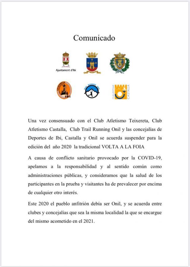 La darrera fita d’aquestes característiques que ha caigut del calendari esportiu a la sub comarca Foia de Castalla és precisament la Volta a la Foia. La prova, que es divideix en carrera i passeig, ha sigut desplaçada al 2021 per l’organització, que inclou als clubs d’atletisme de Castalla, Ibi i Onil i als seus respectius ajuntaments. Pel moment no s’ahn fixat dates concretes per a la seua celebració el proper any.