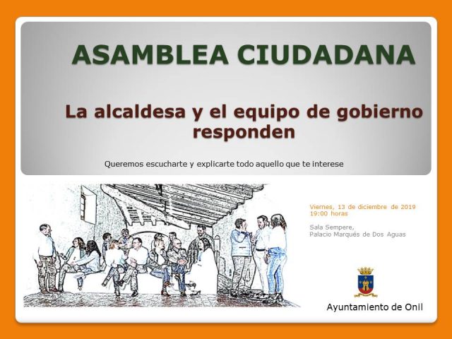 A l’interior de la província d’Alacant ja són diversos els exemples d’equips de govern que obrin espais de diàleg amb la ciutadania de la seua localitat. Entre elles Castalla, que celebra assembles obertes amb la ciutadania per a explicar la seua acció de govern. Ara, altra localitat de la Foia s’afegeix a aquesta forma d’actuar en ares d’una millor transparència. És Onil, on el seu Ajuntament ha convocat als veïns a un acte públic el proper divendres 13 de desembre a partir de les 19h al Palau del Marqués de Dos Aigües.