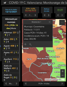 En el cas de Cocentaina presenta 41 casos actius als últims 14 dies i augmenta la incidència acumulada de 286,46 de la passa actualització a 355,90 en la recent actualització, per aquest motiu se situa al municipi en risc extrem al passar de 250 d’incidència per cada 100.000 habitants. Per la seua banda, Muro augmenta la seua incidència de 311,33 a 483,09 un altre municipi que es troba en risc extrem. A més, contabilitza un total de 45 casos positius ara mateix.