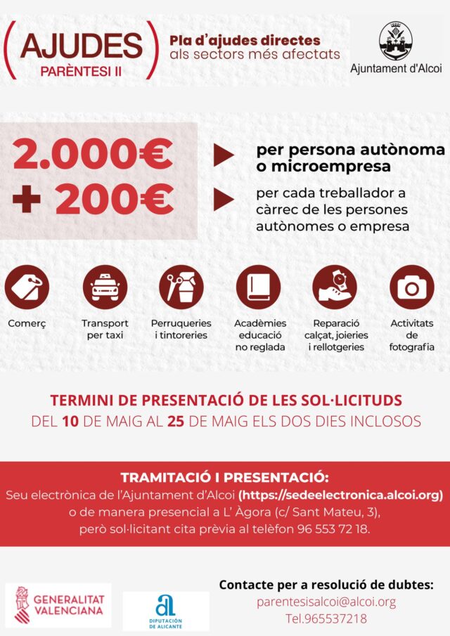 L’Ajuntament d’Alcoi ha obert el termini per a sol·licitar els 733.000 euros en ajudes directes a empreses i persones autònomes de sectors afectats per la pandèmia del coronavirus. Aquestes subvencions formen part de les Ajudes Parèntesis II, incloses en el Pla Resistir de la Generalitat Valenciana i aprovades després de finalitzar les Ajudes Parèntesis I.